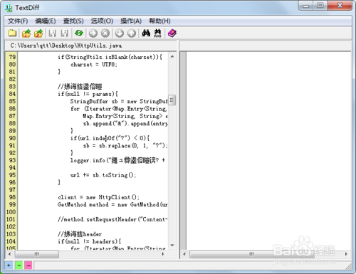 首先打TextDiff工具,它的窗口是被分成2半的,一个放文档1,一个放文档2的,如图