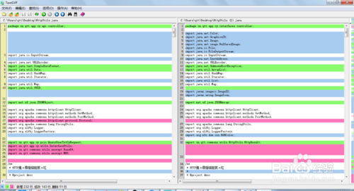 点击比较按钮,窗口就会发生变化,出现3中颜色红紫,蓝,绿;红紫代表文件一多出的内容,蓝代表文件二多出的内容,绿代表2个文档都有但是不一样