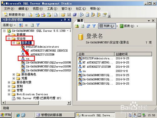 左边展示很多树形的文件夹,双击“安全性”或点击“安全性”前面的“+”号 展开文件夹,然后双击“登录名”或点击“登录名”前面的“+”号展开文件夹。如图所示: