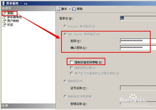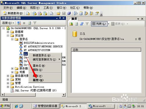 在登录名为sa的右键点击,选择“属性”。如图所示: