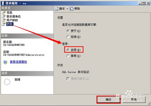 点击左上角的“状态”,在右边“登录”下面选择“启用”,然后点击“确定”按钮。如图所示: