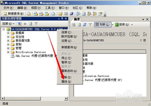 在左边树形框服务器名称那里右键点击,选择“属性”。如图所示: