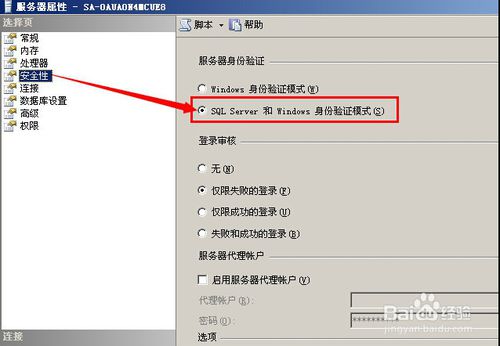 点击左边的“安全性”选项,然后在右边选中“SQL Server 和 Windows 身份验证模式”,然后点击“确定”按钮。如图所示:
