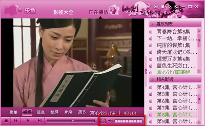 3、有些人喜欢直接一些,这也是最常用的要领 ,乐鱼的音量调节器位于播放器右下方,由十个黄色的方格组成,每一个方格代表一个音量级别,级别从左到右由低到高排列,最左边的为静音,网友手动配置 方格的位置即可。如下图所示: