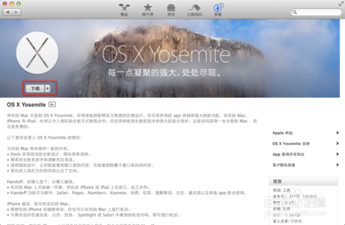 在App store找到OS X Yosemite系统,然后,单击『下载』按钮,免费下载OS X Yosemite系统。