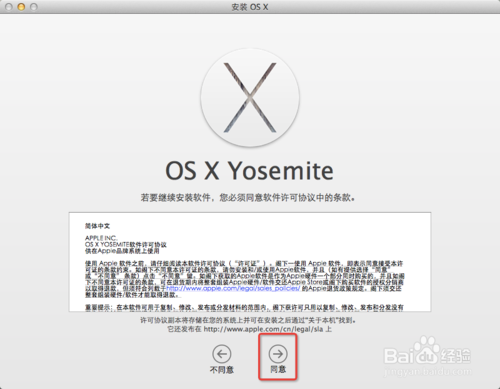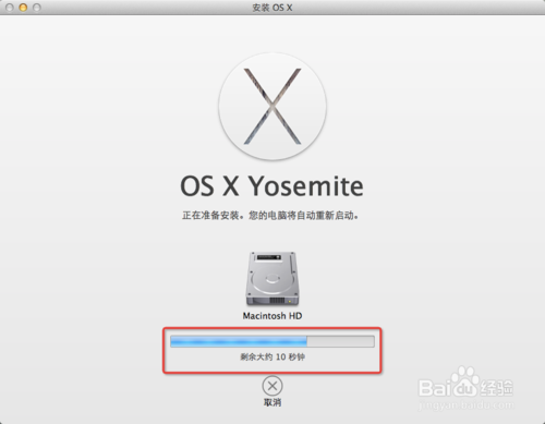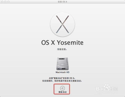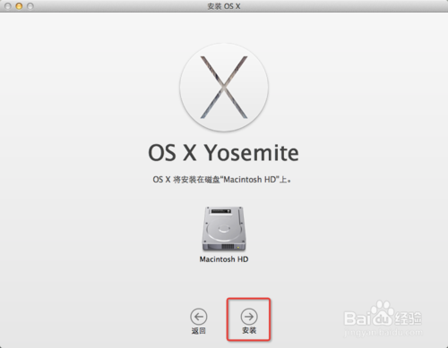 在『OS X将安装在磁盘“Macintosh HD”上』选择安装的磁盘,这里只有一个磁盘,直接单击『安装』。