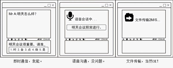 它有点像你平时使用的即时通讯软件,可以在线聊天、语音、传输文件