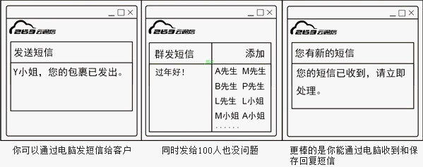 可以给联系人,部门,群,输入/导入号码发送短信,支持双向互动,移动,联通,电信全覆盖