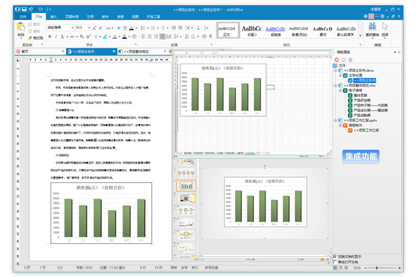 二、文件集成:多个文档产生的数据可同时保存到一个单一的文件中,便于管理与共享数据。永中集成Office一个集成文件中可以保存的文字处理文档、简报以及工作表个数无限制,同时也支持将多个Excel、Word、PPT文件导入到同一个集成文档中,也可以将集成文件中的某个文档、简报或工作表导出为一个独立的文件。)