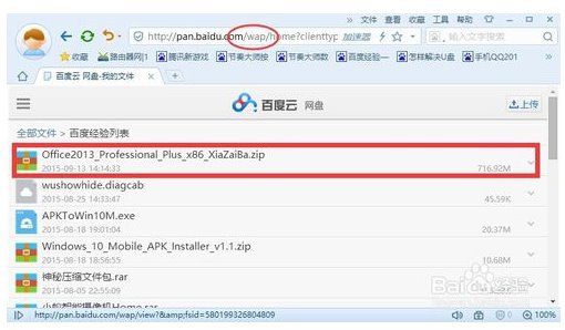 如果想从自己的百度网盘中下载大文件,同样登陆百度网盘,并进入想要下载的文件目录,将地址栏中的网址进行修改,将其中的“disk”修改成“wap”,如图所示: