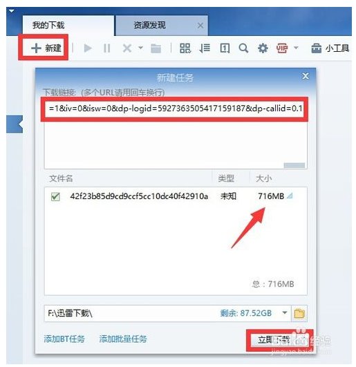最后打开“迅雷”程序,点击“新建”按钮,从弹出的“新建下载任务”窗口中,粘贴文件下载地址,点击“立即下载”按钮即可使用迅雷下载百度网盘大文件。