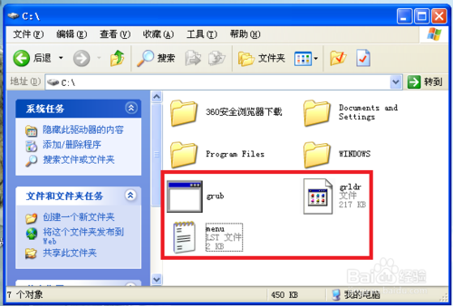 1、解压并复制目录中的menu.lst、grldr.mbr还有chinese文件夹中的grub.exe、grldr到系统盘