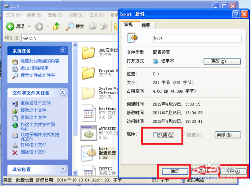 取消系统盘下的boot.ini的只读属性、应用–确定