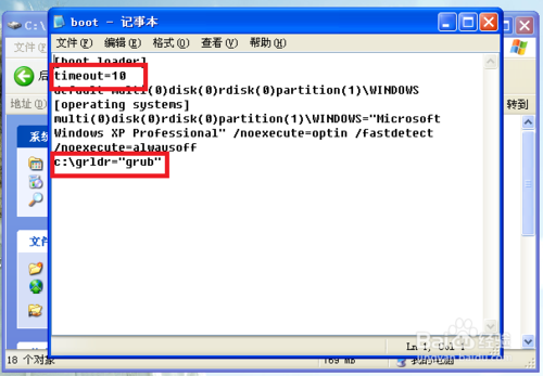 在boot.ini中添加c:\grldr=”grub” 并把上面的 timeout=10