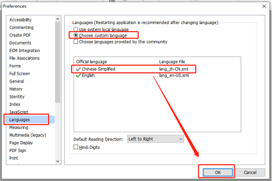 2、选择“Languages”–>“Choose custom language”–>“Chinese-Simp”, 设置完这些点击OK确认即可.这一步骤对应的则是中文界面的“语言”–>“选择自定义语言”–>“简体中文”。