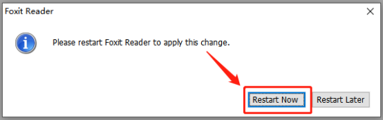 3、这时候系统会弹窗再次确认,这一步的意思是重启福昕阅读器更改应用,点击“Restart Now”即设置成功。