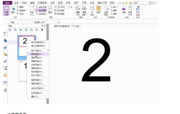 5、也可以通过左边栏的缩略图预览,然后在要删除的页面缩略图点击右键,选择“删除页面”,后续操作与前面的一致。