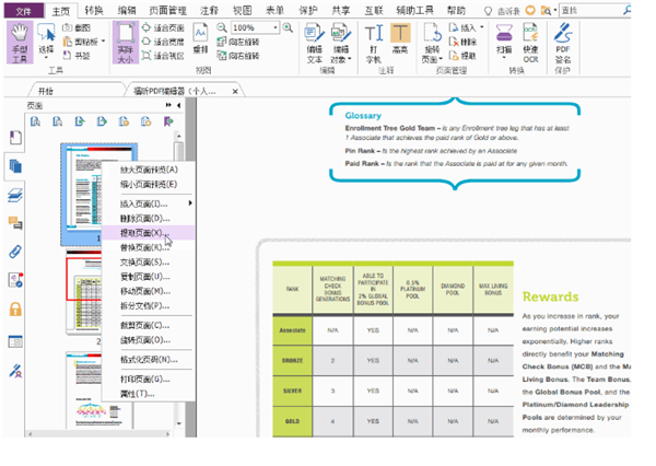 2、对于那些文件中大部分都是需要的资料,要将少部分的空白页或广告页删除的,可以见到“页面管理-删除”或者点击左边的“查看页面缩略页”选中需要删除的页面,鼠标右键点击选择删除页面。
