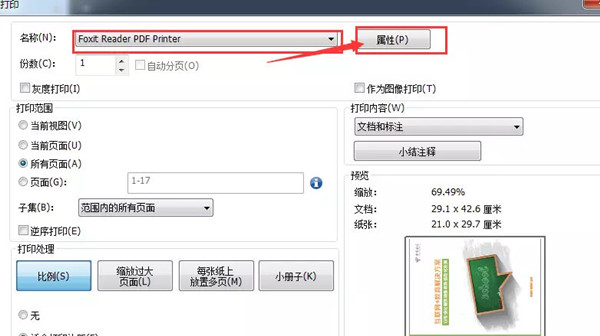 3、在弹出的打印窗口中名称选择“Foxit Reader PDF Printer”,然后点击“属性”。