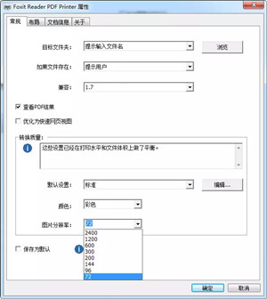 4、在弹出的属性窗口中选择不同的“图片分辨率”即可改变PDF文档大小。分辨率越小,输出的文件就越小。这里以分辨率72为例,点击确定开始压缩。