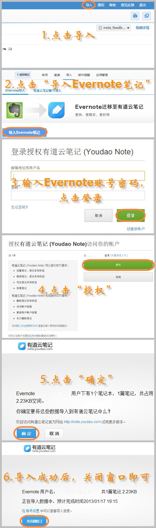 第三步在弹出的授权页面输入evernote的账号和密码。第四步在弹出的窗口核实您的账户信息后,点击授权。第五步在核实您的evernote笔记信息后,点击确定。第六步再导入成功后,点击关闭窗口。