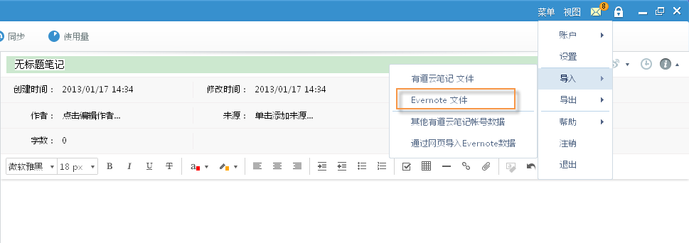 然后,在有道云笔记中点击菜单-导入-evernote文件来导入笔记。