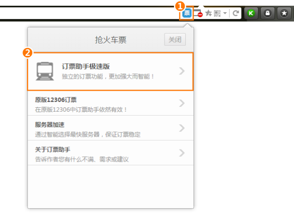②点击地址栏右侧的“票”图标,建议首选“订票助手极速版”。因12306改版导致极速版不能正常使用时请选择“原版12306订票”。