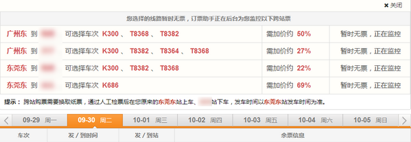 ⑥刷票时软件会自动根据你设置的车次和席位监控是否有余票,此外还会监控领近车站的余票,并按加价幅度排序。