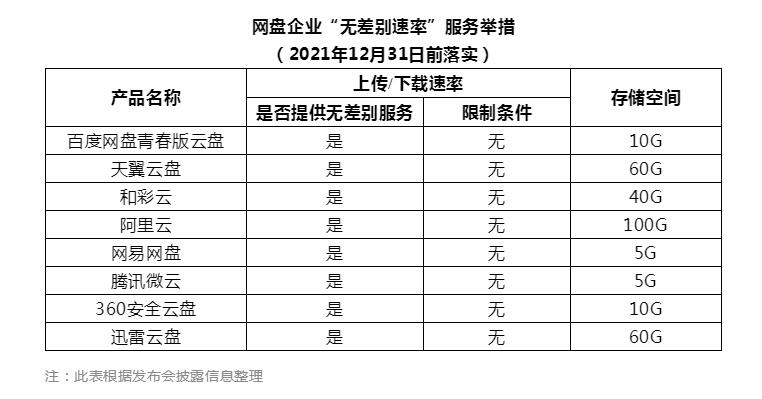 11月17日,工信部组织百度网盘、腾讯微云、天翼云盘、和彩云、阿里云盘、迅雷云盘、360安全云盘和网易网盘等首批8家网盘企业在京共同签署《个人网盘服务业务用户体验保障自律公约》,承诺2021年内将推出“无差别速率”产品,为各类用户分享无差别的上传/下载速率服务。