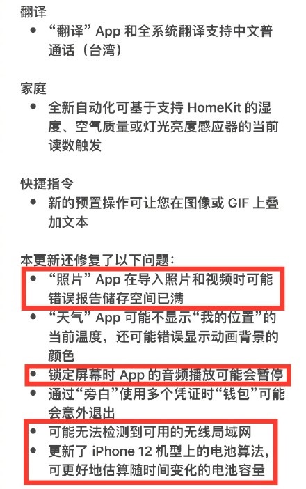 修复了导入视频或图片至照片 App 时显示存储空间已满的问题、修复了锁屏状态下音乐播放可能会停止问题、修复了可能无法检测到无线网络等等。