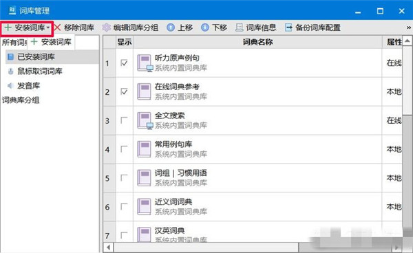 在词库管理中点击左上角的安装词库,选择自己需要安装上去的词典进行安装