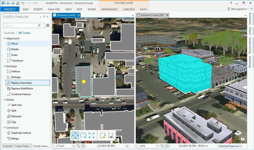 使用上下文相关工具简化数据编辑和分析。 执行交互式 2D 和 3D 分析。 使用 ModelBuilder 或 Python 自动进行工作。