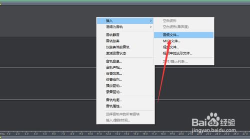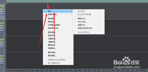 第三步,移动到音轨1过后,鼠标点击右键,选择插入,然后再选择刚才下载的文件“音频文件”。