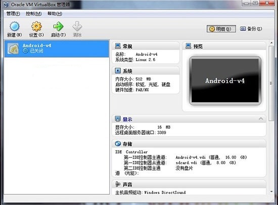 2、之后 Virtualbox 便会启动,你可以看到已经有一个叫做 Android-v4 的虚拟机了,我们选择后启动它即可