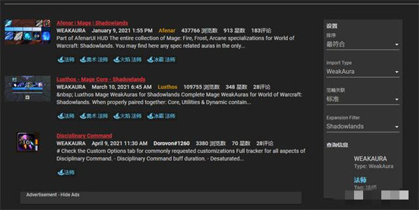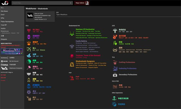 在这里小编可以推荐一个网站https://wago.io/weakauras,这是目前最大也是最全面的WA分享网站,玩家们可以在该网站找到各个职业的插件设置字符串,并且在选择界面也可以清晰的看到该WA导入后的预览图。不同字符串下的监控图形都是不一样的,玩家们可以根据自己喜好选择最实用也最为好看的一款进行使用。