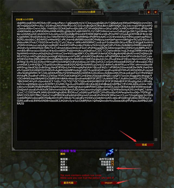 随后在各大插件平台上下载安装Weakauras(如桃乐豆),在聊天框处输入指令/WA呼出控制台界面,并选择右下角的导入,再将刚才复制好的字符串一键粘贴进去即可看到屏幕中心的WA监控模型。