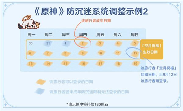 由于防沉迷系统限制,旅行者 B 无法于 8 月 31 日、9 月 1 日(周二,周三)登录游戏,而在 9 月 2 日他已成年,可以正常登录游戏。那么「空月祝福」剩余生效期内,他因未成年在线时长限制无法登录的日期总共有 2 天。他会通过邮件获得 2*90=180 原石的补偿。