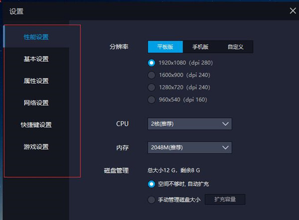 5、设置是最重要的一个功能组,在这里可以设置模拟器的各种属性,也可以控制模拟器不再自启动等;
