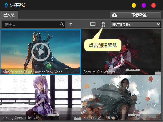 打开RainWallpaper,点击界面右上角的“创建壁纸”按钮(如下图)