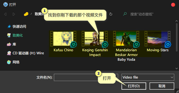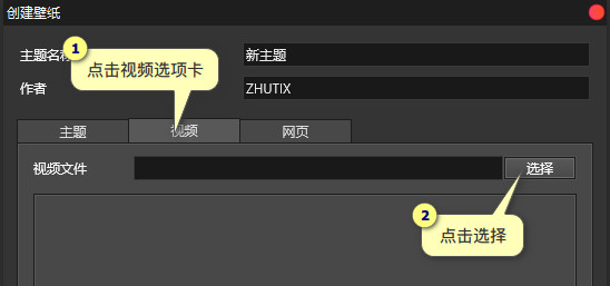 在创建壁纸窗口里面,选择“视频”选项卡,然后点击“选择”(如下图)