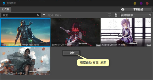 你也可以按照上面的步骤,再添加一些壁纸,想换就换,需要注意一点儿,添加新壁纸后,需要在软件主界面刷新列表才会显示新壁纸(如下图)