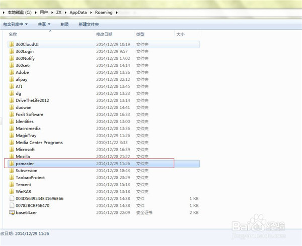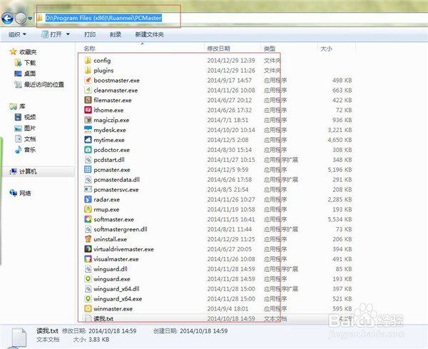 2、找到软媒的安装目录,将PCMaster文件夹下的所有文件夹,文件选中,删除。