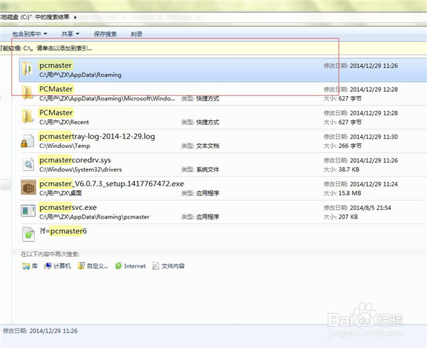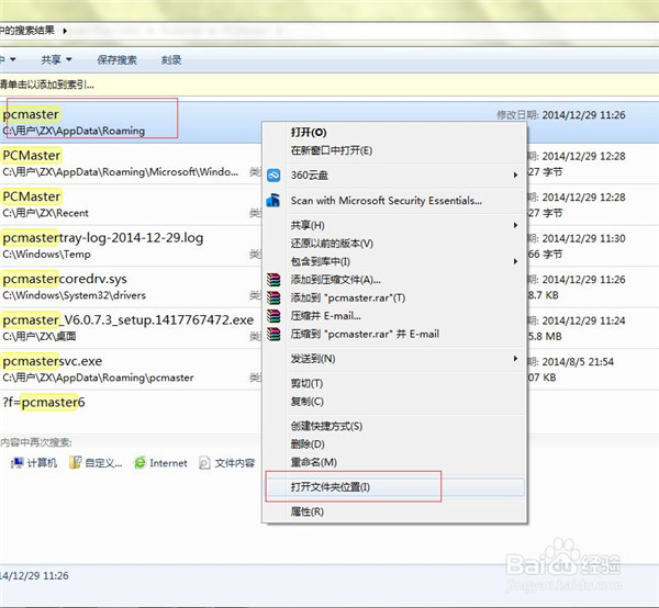 3、在计算机C盘中搜索“pcmaster”文件,找到文件之后,选中文件夹,右键选中“打开文件夹位置”,删除pcmaster文件夹。