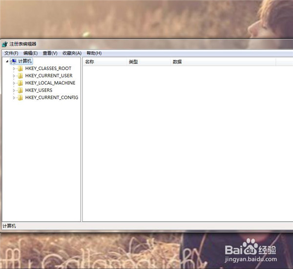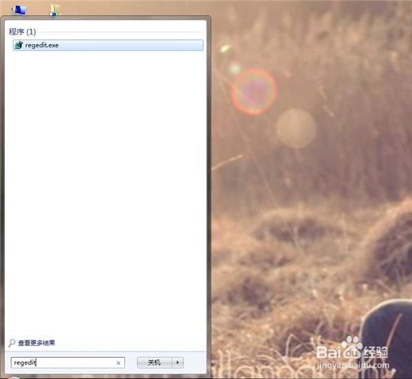 4、点击“开始菜单”,输入regedit,回车,显示注册表界面。