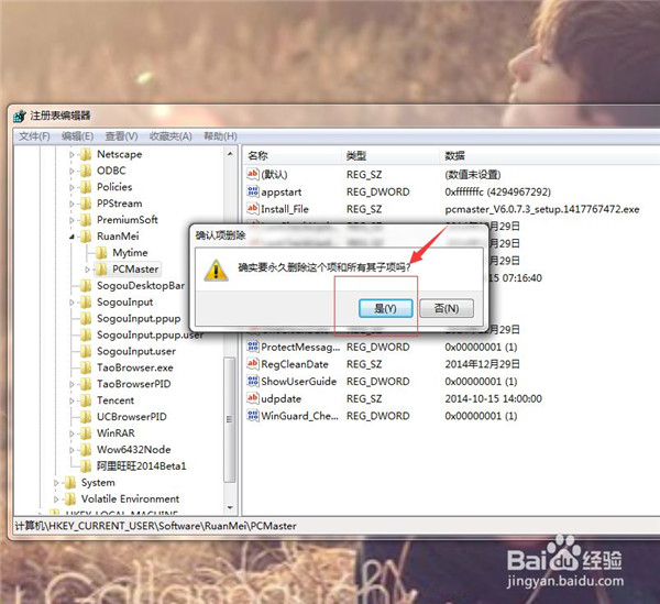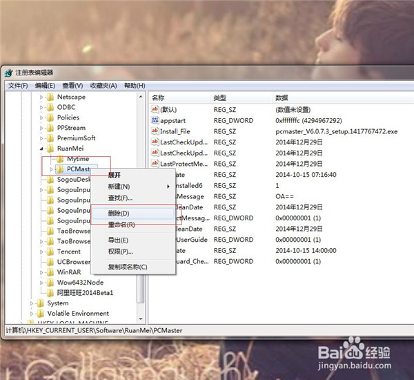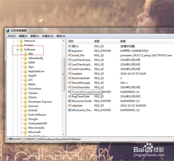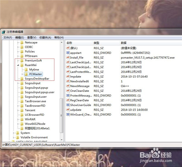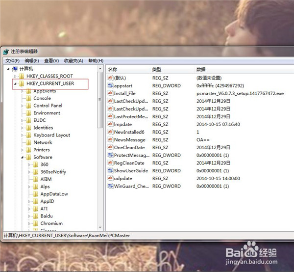 5、选中树形分支“HKEY_CURRENT_USER”,依次找到“Software“,”RuanMei“,”PCMaster”。