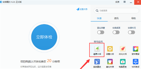 2、进入到软媒魔方完整版绿色版主界面,如下图所示,在界面中间有立即体检选项,在界面的右侧上方有快捷、资讯、导航三个类型。在下方还有常用的应用,里面有很多在生活中需要用到的小工具。总体来说界面很简洁整齐。