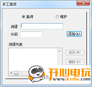 鼠标右键单击输入法状态栏,在窗口中选择“手工造词”功能项。 通过手工造词,可以自定义新词,也可以对用户扩展词库进行维护操作,以满足用户的特殊需要。同时可进行单字五笔编码的前两位查询。