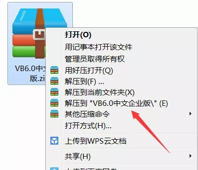 1、将下载文件复制到除C盘以外的盘符,土豪请随意。右击软件压缩包,选择解压到“VB6.0”。