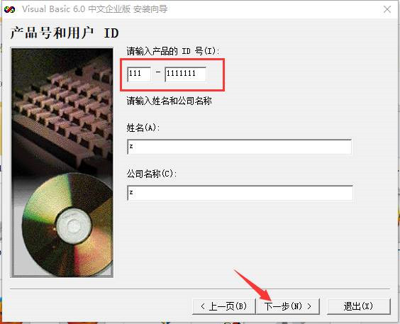 6、输入产品的ID号:111-111111,其他随便填,点击下一步。