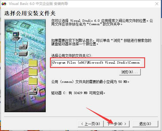 8、点击浏览更改文件位置,默认安装在C:\Program Files (x86)\Microsoft Visual Studio\Common(建议安装在除C盘以外的磁盘上,可在D盘或其它盘新建文件夹Common根据你装软件的习惯来)选择好以后点进行下一步。注意:文件夹名为Common。